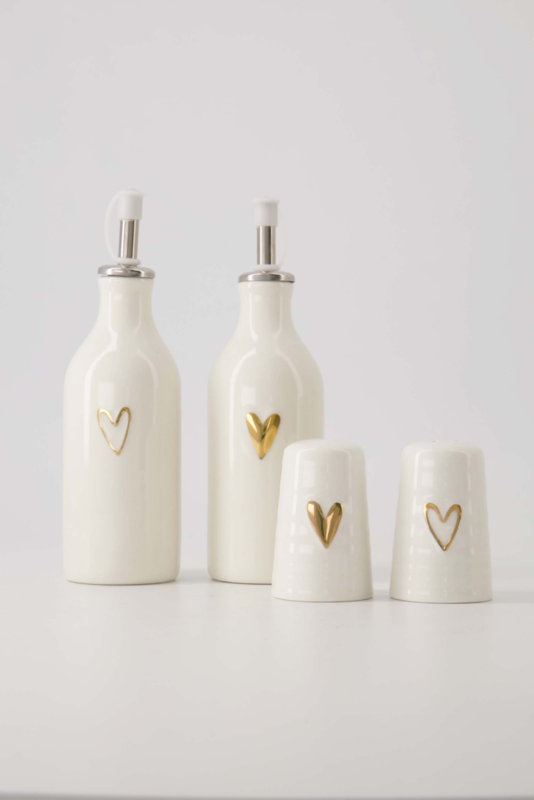 OverzichtHet Zusss keramiek peper en zout stel brengt warmte aan je keukentafel met een subtiel wit en goud design. Dit keukenaccessoire, gemaakt van hoogwaardig keramiek, is voorzien van schattige hartjes in goud die het helemaal eigen maken. Het peper en zout stel is een sfeervol detail dat in elke keuken past en zorgt voor een persoonlijke touch tijdens het eten. Het wit en goud combineren mooi en geven een basic maar stoere uitstraling aan je servies.
